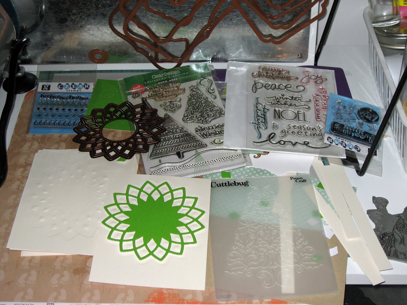 Happy day-before-Turkey Day! I am all ready to eat!!! I am not contributing one thing to the meal this year...how lazy of me right? Well in my defense my family is very tiny and it will just be my Grandma, my Dad and myself this year so...since they are the original good cooks in the family, I defer to their awesome cooking abilities...they don't need a third cook in the kitchen. In fact it rather annoys my father to have any other cooks in his kitchen so I will be on the couch coloring my holiday card images. As for What On Your Workdesk....I stamped off about 40 images last night in preparation. In my desk photo you can see that I have placed the things I want to work with in a basket and on the desk and I will be packing them in my bag tonight to take with me to my Dad's. I have preselected the copics I want to use and put them in my little clear plastic baggie so I can find them easily...